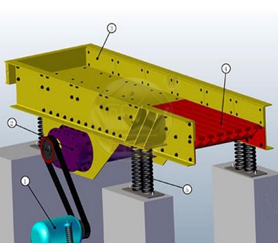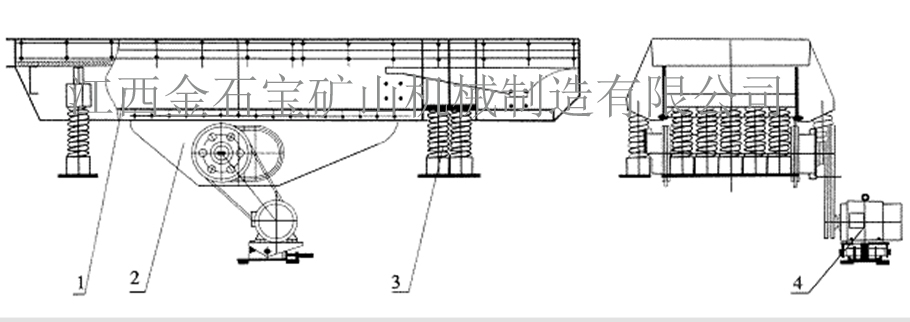 1. 振动机架(给料槽);2. 激振器;3. 减震弹簧及支座;4. 电机及支座